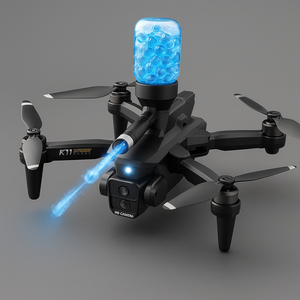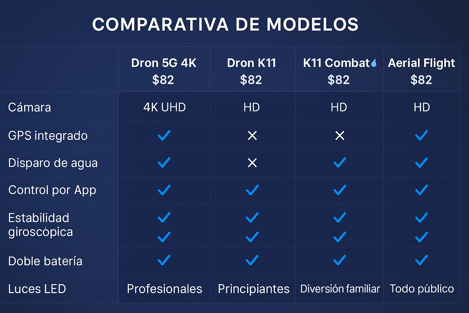Los 4 drones (Dron 5G 4K, Dron K11, Dron K11 Combat y Dron Aerial Flight) sobre fondo azul cielo con reflejos metálicos.